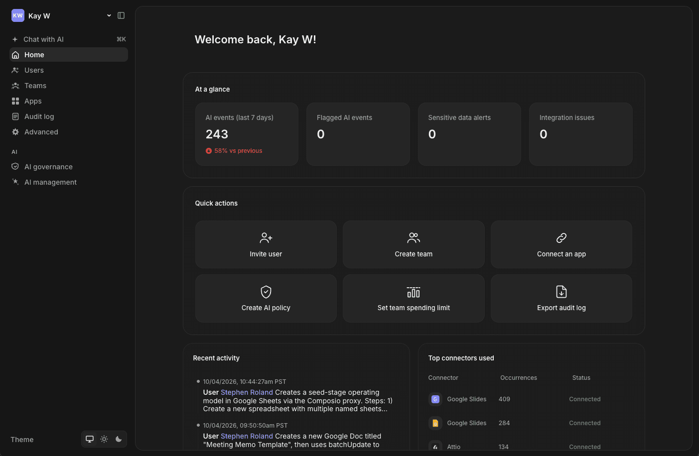 Get a complete audit trail of every action and prompt to support security reviews, threat detection, and compliance.